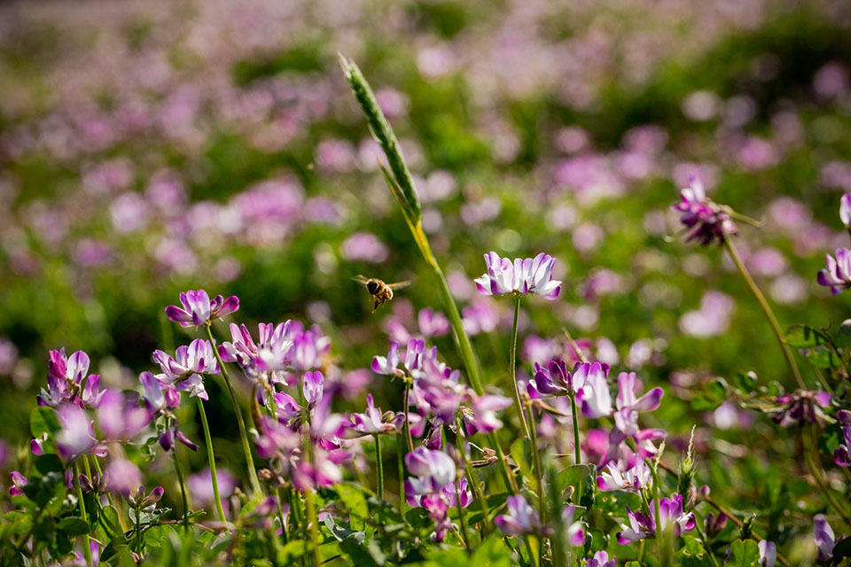 ファーム貞光に近いレンゲ畑では、緑肥として5月中旬に鋤き込むまで蜜蜂が飛んでくる