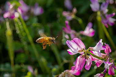 ファーム貞光の蜂場近くにあるレンゲ畑に花蜜を採りにきた蜜蜂