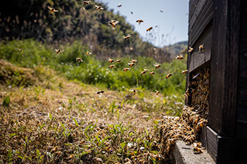 穏やかな春の晴れの日、「吉野さん」蜂場で蜜蜂が活発に巣箱を出入りする