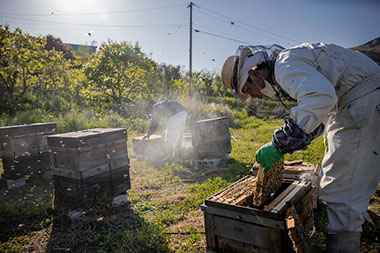 「安永さん」蜂場で内検をしていた雅彰さんが、卵のある巣板を女王のいない群に移動する
