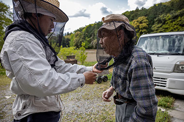 好奇心旺盛に採蜜の様子を見に来た祖父の朝夫さんに遥輝さんが面布を被せてあげる