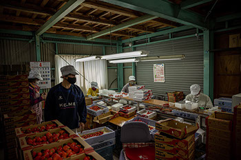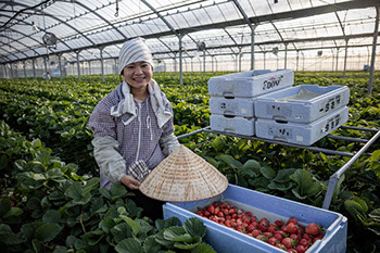 プチッとイチゴの細い茎を折る微かな音が聞こえる。ファーム貞光の全従業員7人でイチゴの収穫が始まったのだ。ベトナムから来ているグェン・ティ・フォンさん(26)とグェン・ティ・ティンさん(24)の2人がファーム貞光で働き始めて丸1年。