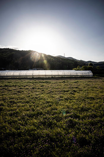 傾き掛けた夕陽がイチゴハウスを輝かせ、隣にレンゲ畑が広がる