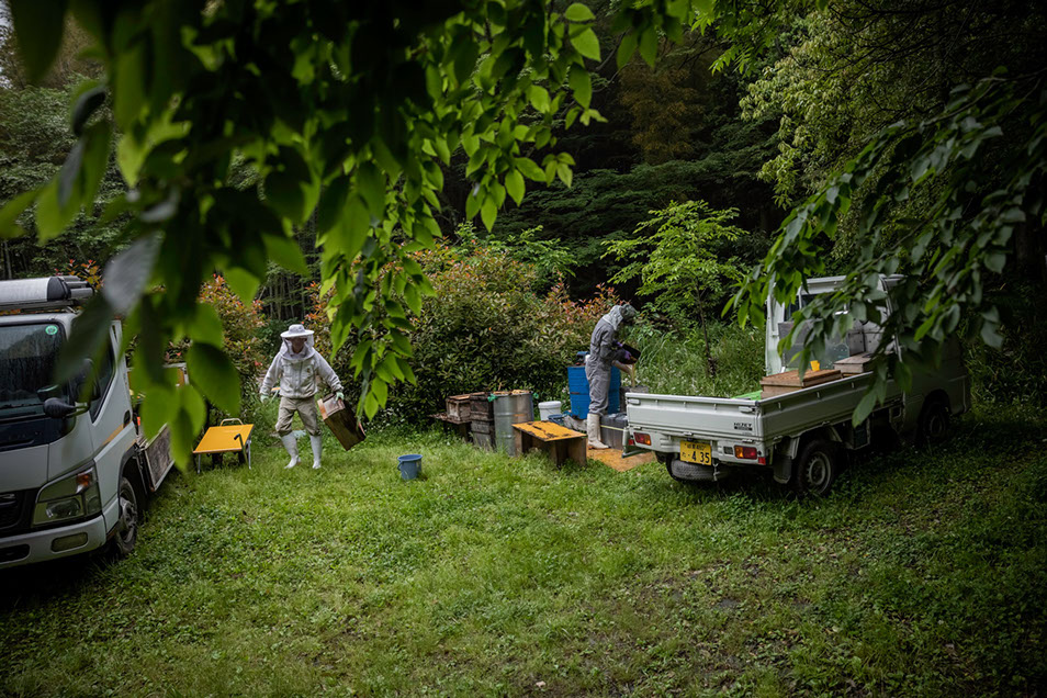 栗原蜂場での採蜜が終わり住夫さん(左)と翔太さんが片付けを始める