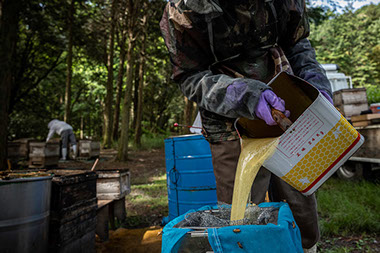 試食用の蜂蜜を数種類小さなスプーンで食べさせていただく。初夏の里山蜜を口に入れた時だ。「ソヨゴ蜜が主体となったこの蜜は少し苦みがあるでしょ。甘みと苦みは舌の感じる部位がすぐ隣なので、苦みを感じることによって、甘みをより強く感じられることがありますね」。言われてみて初めて感じられるほどの苦みだが、蜂蜜の甘みと微妙な苦み、それと香りの繊細さが重なり合って、木々の花咲く風景を立体的に描いてくれる気がした。