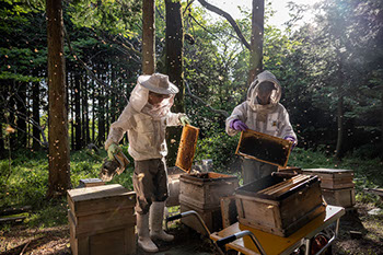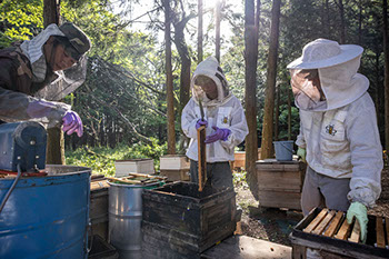 午前6時30分に集合して採蜜の蜂場へ、翔太さんは少し眠そうだ