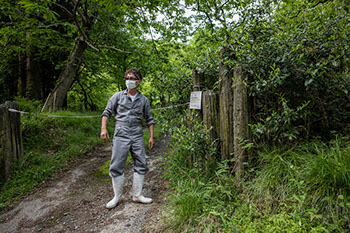 大滝蜂場ゲートのロープを閉じた住夫さんが振り返って