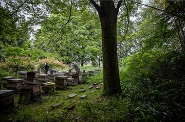 午前6時30分頃、事務所を出発する前、蜜蜂群にいるウイルスの感染予防として、住夫さんが蜂払い器にセットするスポンジに弱酸性水を染み込ませている。栗原蜂場は巣箱が並んだ奥に樹齢の積み重ねを思わせる大きなケヤキが印象的だ。