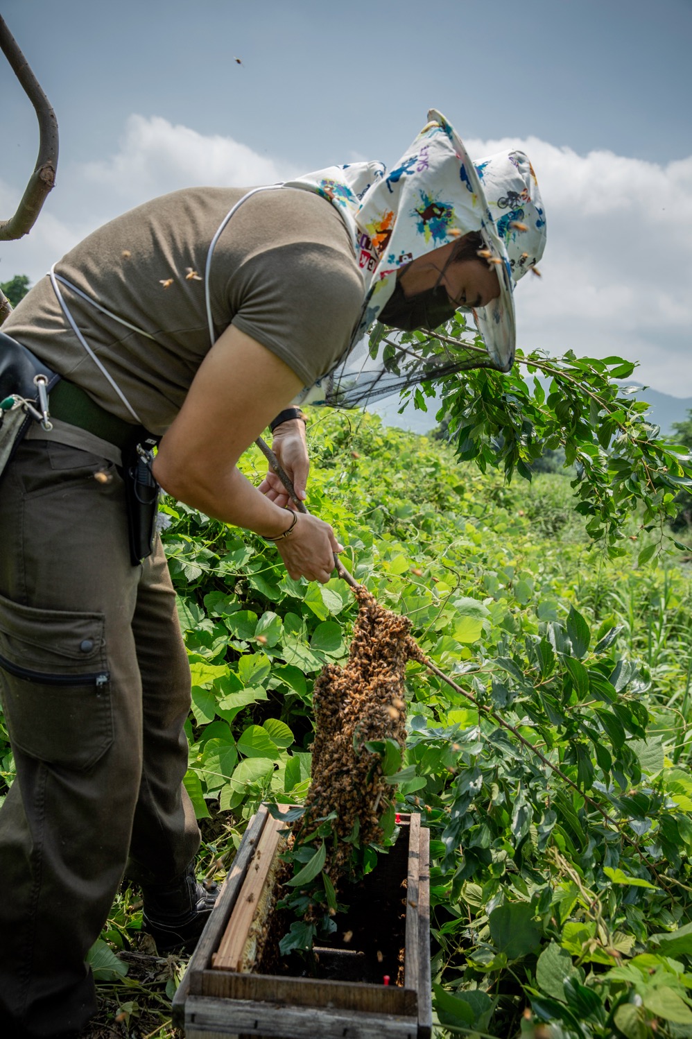 谷島蜂場で分封していた群を巣箱に払い落とそうとする貴一さん