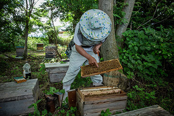 山瀬蜂場で内検をしていた山本技術部長が女王蜂の存在を確認する