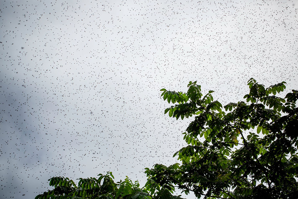 三岩(みついわ)蜂場に到着するなり、小笹元矢(おざさ げんや)さん(36)が上空を指して「あれ、分封ですよ」と、私に教える。見上げると、高さ7、8mもあるエンジュの梢付近を無数の蜜蜂が飛び交っている。