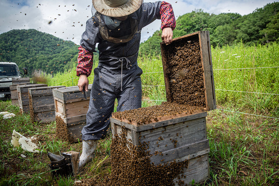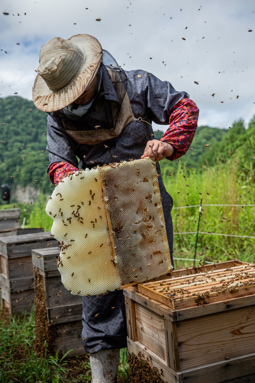 「今年は異常ですよ。(採蜜群を)作って1ヵ月で分封しちゃったり。こんなことは今までにないです。エンジュの流蜜が良くて、ガツッと入って、花(の期間)は2週間ないくらいですけど……。エンジュがドカッと入ったのは、これまでにはないんで……、8年くらい前に1回あったかな」