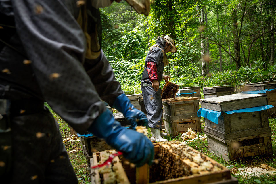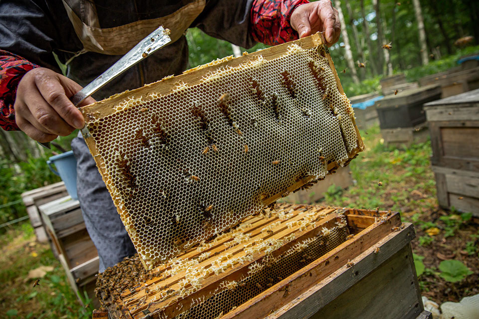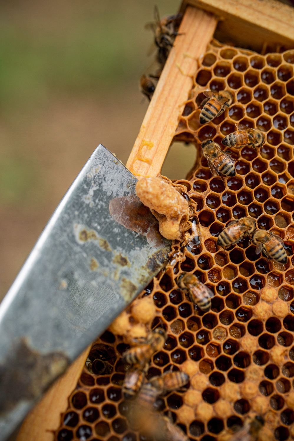 太史さんが継ぎ箱から巣板を引き出すと、蜜房に溜まった蜂蜜が太陽に照らされてキラキラと輝く。巣板の下の方に幾つもの王台が飛び出している。太史さんは一つひとつの王台をハイブツールで根から削り取っていく。小指の先ほどの王台が幾つも出来ているということは、それだけその蜜蜂群の勢いがあることの証しでもあるので、歓迎すべきことなのだが、王台をそのまま置いて新女王が誕生すると、元から居た旧王は半数近くの働き蜂と共に分封をする動きが出てくる。そのためには、王台を潰しておかなければならないのだ。