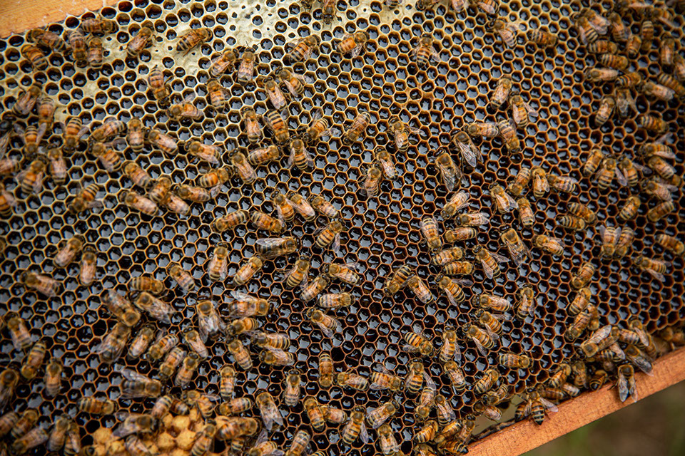 「気温が高くて、流蜜が重なると余計ですね。巣板の下の方に小さな王台が幾つもできていますね。4日間で蜜巣板がほぼ一杯になっていて、今年はこれまでにないくらい良いですね。(蜂蜜の糖度が高くなる)熟成にはまだですけどね」