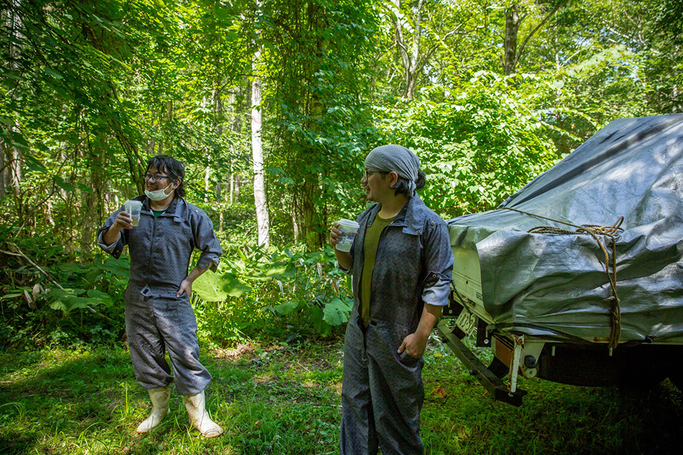 太史さんと元矢さんは、蜂場に到着すると燻煙器に火を付ける前に、準備していたクーラーボックスから氷の入ったカップを取り出しボトルのコーヒーを注ぐ。「熱中症が怖いですからね。僕ら、小まめに休憩は取りますね」。元矢さんが、私にもアイスコーヒーを勧めてくれる。