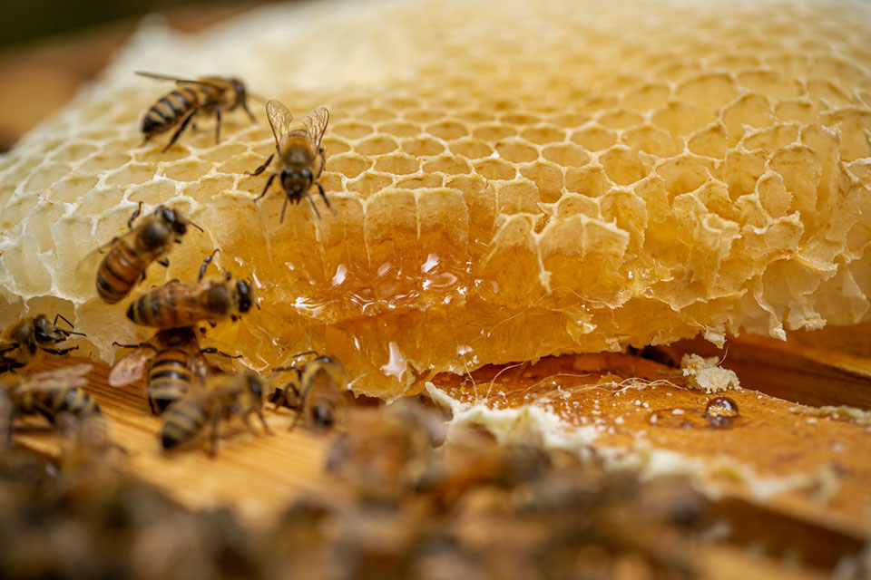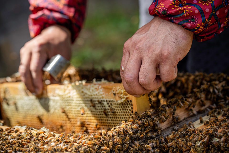日髙蜂場では4日前に採蜜したばかりだが、すでに蜜巣板は満杯状態。蜜蓋も巣板の上部に半円を描くように出来ている。太史さんの内検は丁寧だ。巣箱を覗き込むようにゆっくり蓋を開け、巣箱の後ろ側に裏返して置く。その上に、巣箱の真ん中から取り出した巣板を巣箱に立て掛けるように置いた後、外側の巣板を取り出してじっくり巣房の状態を見つめる。外側の巣枠にはムダ巣が付いていることが多い。切り取ったムダ巣を面布をめくって齧(かじ)った太史さんが、報告するように私に話し掛ける。