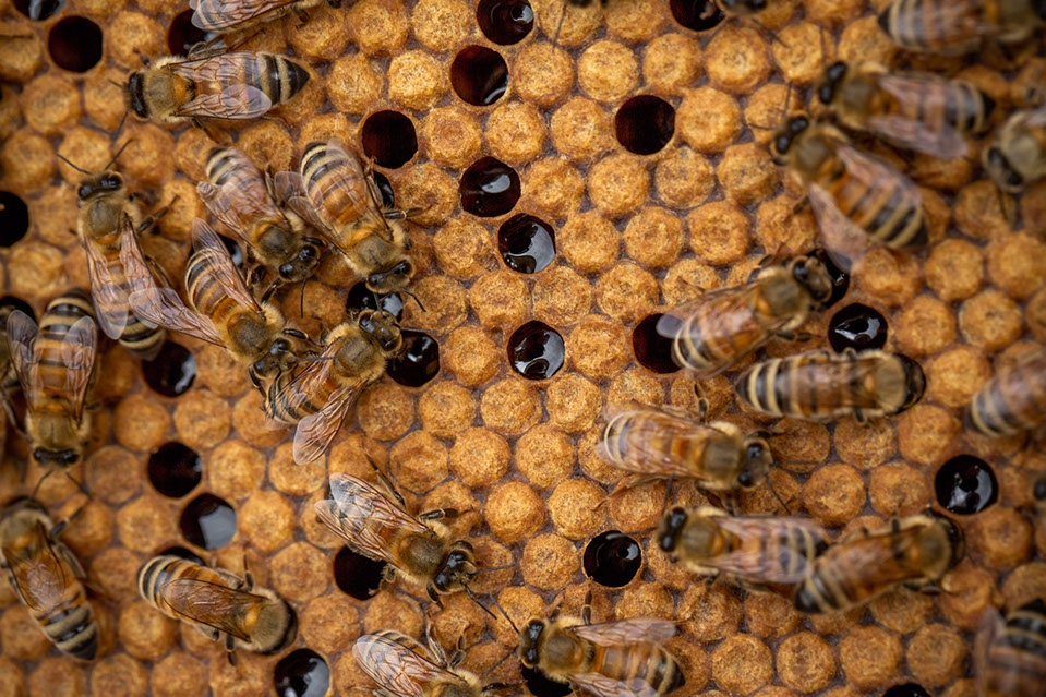 サナギが居る巣房の周りに蜜を溜めた巣房も散在する