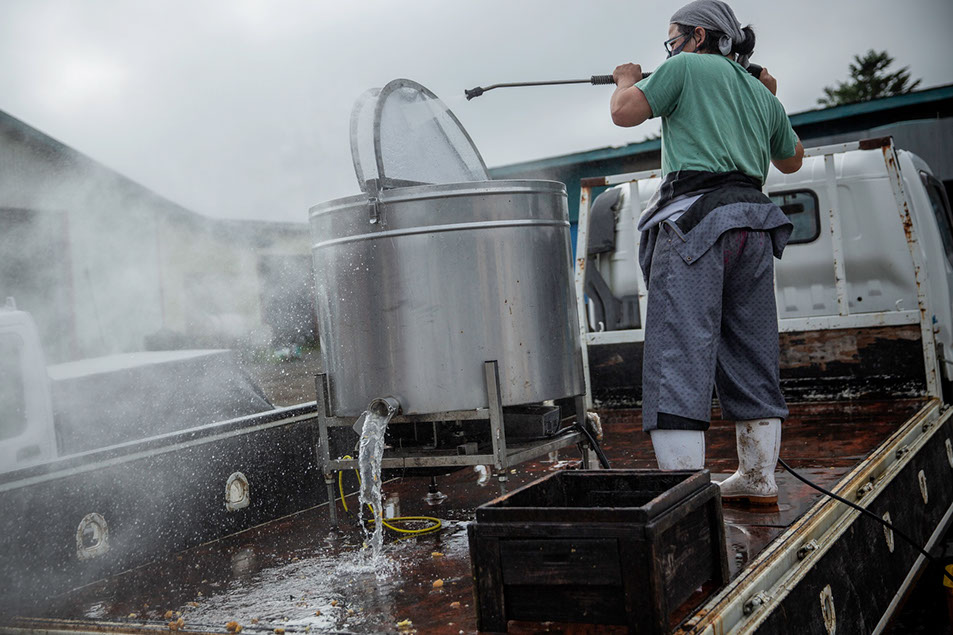 翌日の採蜜のために遠心分離機を洗浄する太史さん