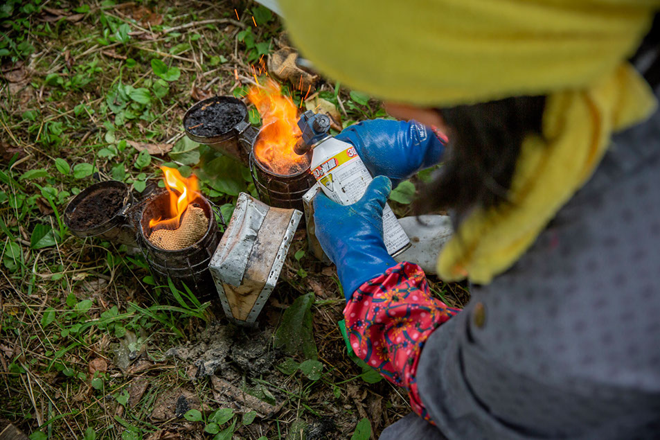 採蜜の準備を整え、巣箱へ向かう前に燻煙器を準備する