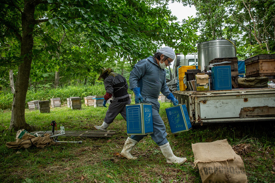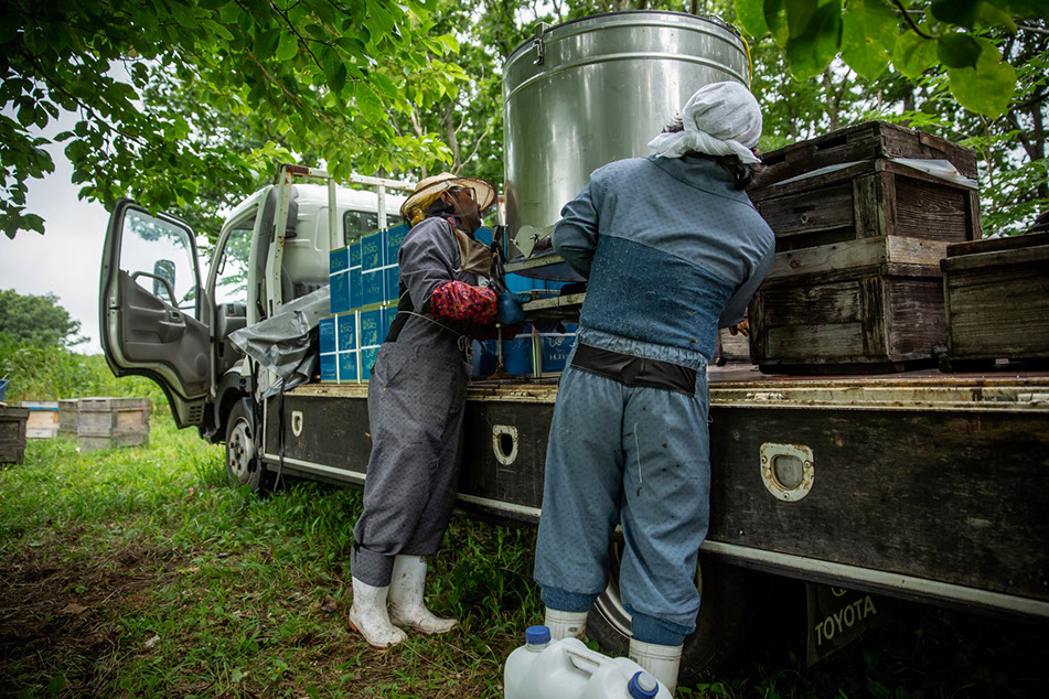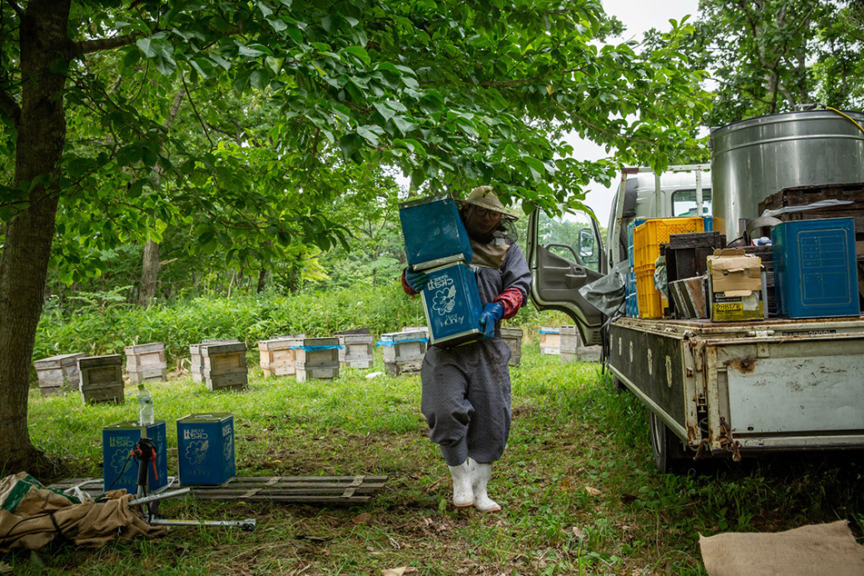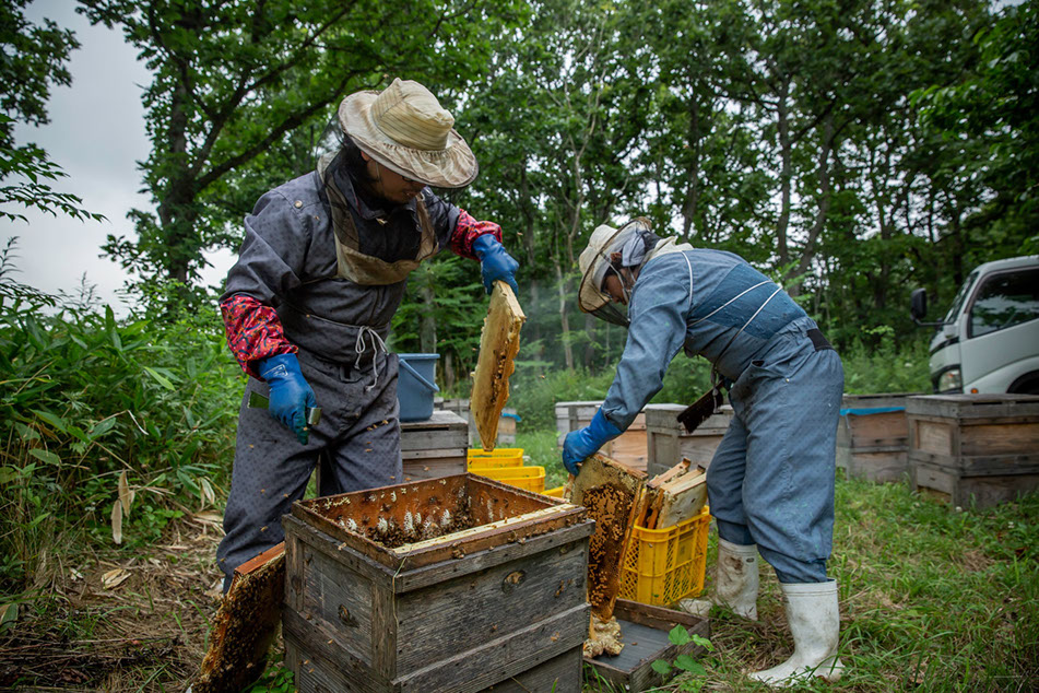 「僕らが始めた頃はシナ蜜が5000円の時代ですよ。どんな蜜でも4万円の時代もあったけど、それが続いたのは2、3年ですかね。今日までよくやってきたと思いますけど、父親が言っていたように、捨てるところはないから。蜂はすばらしい兵隊。自分たちの努力がそのまま結果に出ますから。蓋を開けた時、巣箱の縁にずらっと蜂の顔が並んで、こっち見ている時があって、あまりにも愛おしくてドキッとすることがありますね」