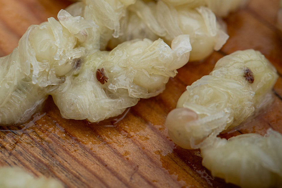 雄蜂の巣房の蓋を切って蛹を取り出し、寄生しているダニを退治する