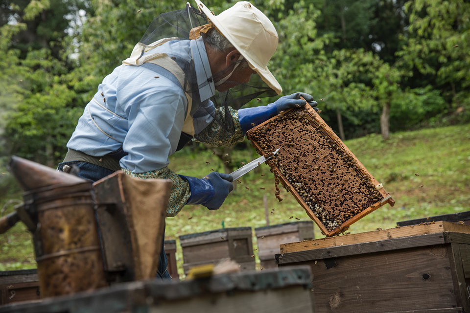 小山田沢口の栗園にある養蜂場で、内検をしながらオス蜂の巣房を切り取る元村宏さん