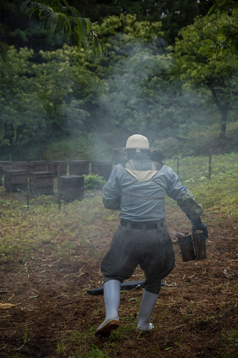 燻煙器の煙で 蜜蜂を追い払いながら養蜂場へ向かう