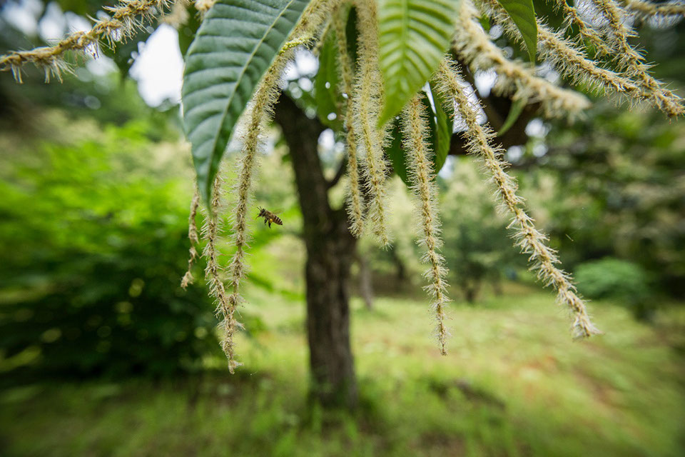 |しかし、西明寺栗の花は例年よりも遅れて、「6月25、26日頃になって蜜が垂れるようになってきましたね」と言う状態だ。その時期と東北地方の梅雨入りが重なったため、蜜蜂は栗の花蜜を採りにいく機会を逸してしまったのだ。私が小山田沢口の栗園にある養蜂場を訪ねた時も、雨こそ降っていないが梅雨空で蜜蜂の元気がない。栗の花は樹によって多少のずれはあるが、ほぼ満開。カナブンや大きい体をしたハナバチなどが、蜜蜂より先に栗の花に寄って花蜜を採り花粉を食べている。今年は、マイマイガの幼虫が大量発生していると聞いた。栗の葉や枝はもちろん幹にも数え切れないほどの毛虫が蠢いている。
