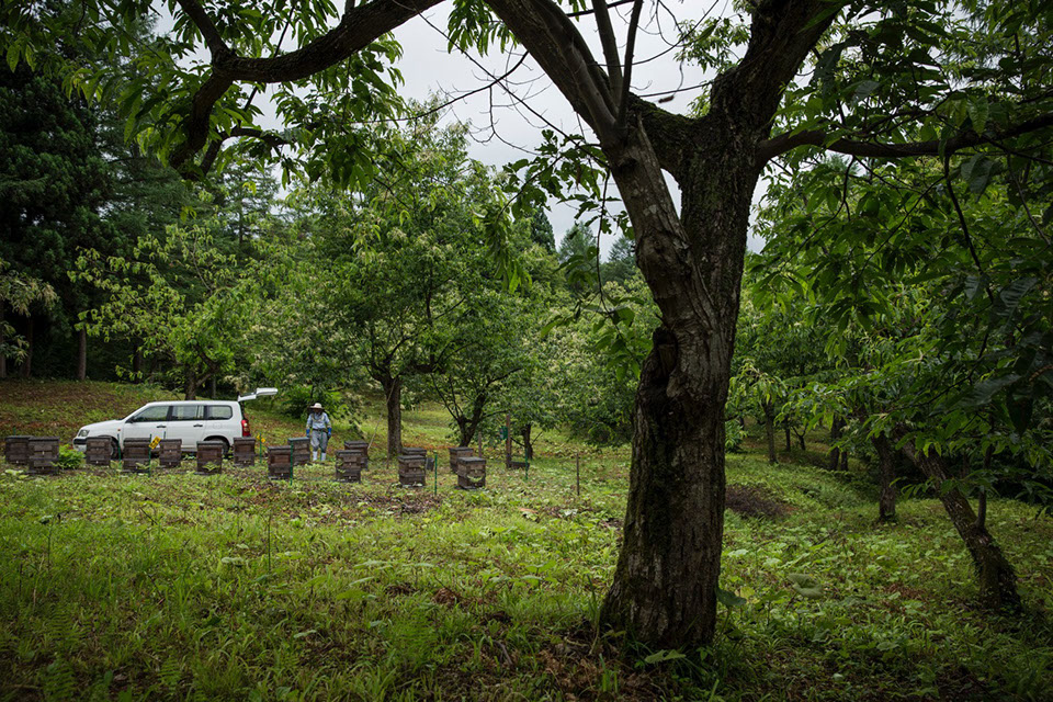 小山田沢口の栗園の真ん中に継ぎ箱15個を置いた宏さんの養蜂場。この日の作業を終えて帰宅の準備をしている
