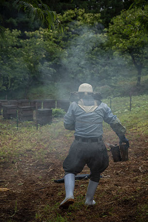 蜜蜂に顔を刺された後でも、残っていた巣箱の作業をするために燻煙器の煙で 蜜蜂を追い払いながら養蜂場へ向かう