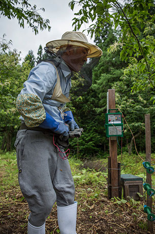 |「私も若い時には消毒したんですよ。雨合羽着てメガネもして、ずぶ濡れになってやるんですよ。体に良いわけがないですよ。良い虫も消毒で殺すのは良くないので、虫喰った栗は売らないという方針で今はやってますから。虫には必ず天敵が居て、自然のサイクルが成り立ってますからね。栗は2月に剪定するんですよ。その時には、雪の表面が凍っていてどこでも歩けるのに、今年は足が雪に入って歩けないんだ。それだけ暖冬だったんで毛虫が大量に発生しているんかね」