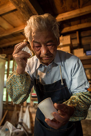 山谷の作業所に戻って、宏さんは蜜蜂に刺された顔の数箇所にプロポリスの水溶液を塗り付ける
