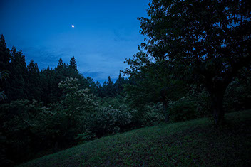 天気予報で、明日の午前中は晴れと伝えている。これから夕焼けになるかも知れないと考え、しばらく栗園の中で様子を見ていたが、西の空は薄い雲に覆われたまま日暮れてしまった。宿に帰ろうと振り返ると、十五夜の次に美しいとされる十三夜月が栗園を囲む杉林の上に昇ったところだった。夕闇の中で微(かす)かに見える白い栗の花が神秘的な雰囲気を醸し出している。