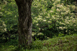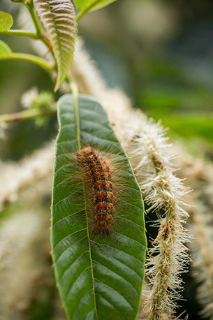 |しかし、西明寺栗の花は例年よりも遅れて、「6月25、26日頃になって蜜が垂れるようになってきましたね」と言う状態だ。その時期と東北地方の梅雨入りが重なったため、蜜蜂は栗の花蜜を採りにいく機会を逸してしまったのだ。私が小山田沢口の栗園にある養蜂場を訪ねた時も、雨こそ降っていないが梅雨空で蜜蜂の元気がない。栗の花は樹によって多少のずれはあるが、ほぼ満開。カナブンや大きい体をしたハナバチなどが、蜜蜂より先に栗の花に寄って花蜜を採り花粉を食べている。今年は、マイマイガの幼虫が大量発生していると聞いた。栗の葉や枝はもちろん幹にも数え切れないほどの毛虫が蠢いている。