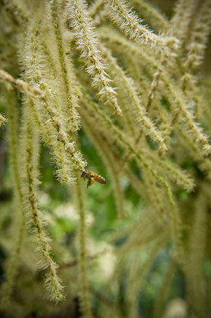 雨の上がった梅雨のつかの間、蜜蜂が口吻を突き出して満開の栗の花蜜を吸おうとしている