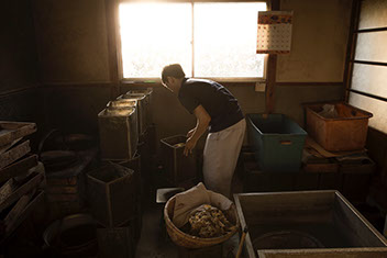 |「ロウ板造りの折には休めんのや。僕ら、自分ちの2階で仕事しておりながら、握り飯かじったり、昼飯交替でやったりね、努力してる訳ですよ。握り飯かじるぐらいはできるんですけどね。お膳に座って食べるなんてことはでけんですよね。その点はやっぱ割り切って仕事しないと」