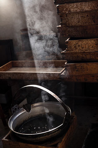 沸騰した蜜ロウの鍋に陽が差し込む