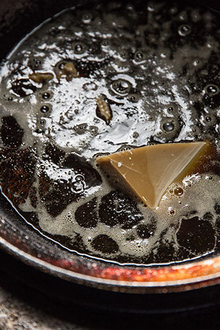 大釜の中で蜜ロウが沸騰し溶け始めている