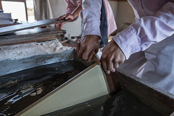 蜜ロウを何層にも絡めた板を水に浸けて冷やし、竹製の小刀で縁を削ぎ落とすと表裏2枚の完成したロウ板が剥がれ落ちる