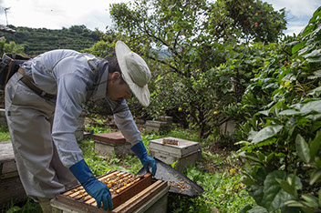 |内検をする恭司さんの仕事ぶりは、すっかり一人前の養蜂家だ。夏には、バイクの一人旅で北海道の養蜂家を訪ね、見聞を広めているようだ。
