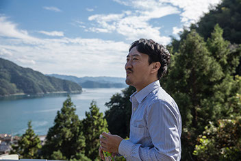 面布を外して休憩する恭司さん。宇和海が眼下に広がる