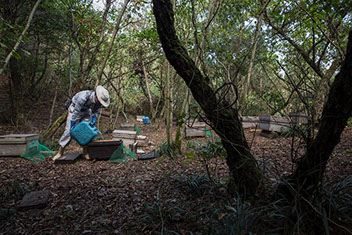|翌日は、巣箱の内検に行く哲夫さんと恭司さんに同行させてもらった。松岡養蜂場の巣箱は、瀬戸内海と宇和海を区切る佐田岬半島の数か所に置いてある。哲夫さんが内検に出るのは、久し振りのことだ。