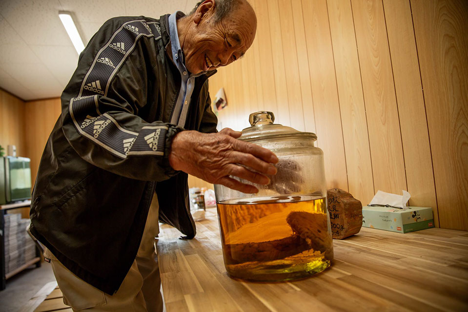 羽毛田慶助さんがアルコール漬けにした500グラムの松茸を披露する