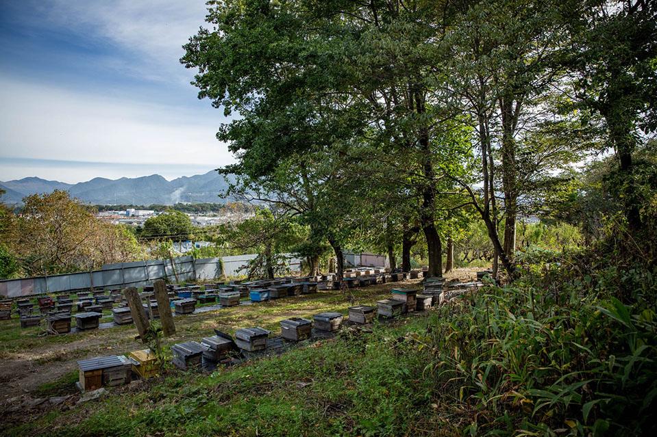 小牧蜂場では特に作業はしないまま、軽トラで小径をさらに奥へ移動すると、ほんの1、2分で小牧奥と呼ぶ蜂場に到着だ。100群ほどの巣箱が置いてある。ここでは軽トラを降りることもなく、巣箱の間を軽トラで走り抜けた。「できるだけ巣箱の近くまで車で行けるように、巣箱の列の間隔を空けているんです」。労働の軽減化に積極的な様子が伝わる。