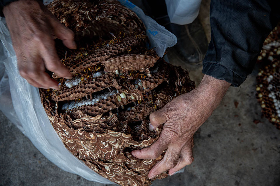 この日の夜、力斗さんは依頼のあったスズメバチの巣を駆除するために慶助さんの長男の英朗(ひでお)さん(50)と、車で30分ほどの地域まで出掛けて、懐中電灯とヘッドライトを頼りに闇の中で古民家の軒先にぶら下がっていたスズメバチの巣を4個も取り除いた。スズメバチの巣の駆除を頼りにされているのは、養蜂家の一つの社会貢献とも言えるだろう。
