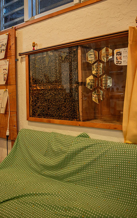 お客が巣箱の中を見られるように外壁に巣箱を設置