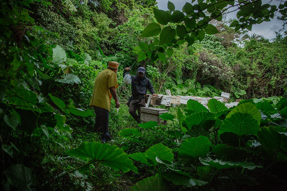 「あれっ、求(もとむ)が来ているのかな」と、勉さんが独り言を呟いている。勉さんの後を追ってクワズイモの葉を掻き分けるように奥に進むと、ちょうど内検を終えて帰ろうとしている二男の求さん(39)と出っくわした。勉さんと求さん、お互いに驚いている様子だ。