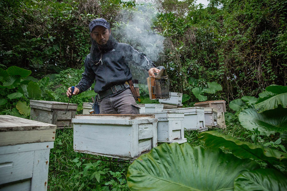 大里蜂場へ行くと求さんが内検を終えて帰るところだった
