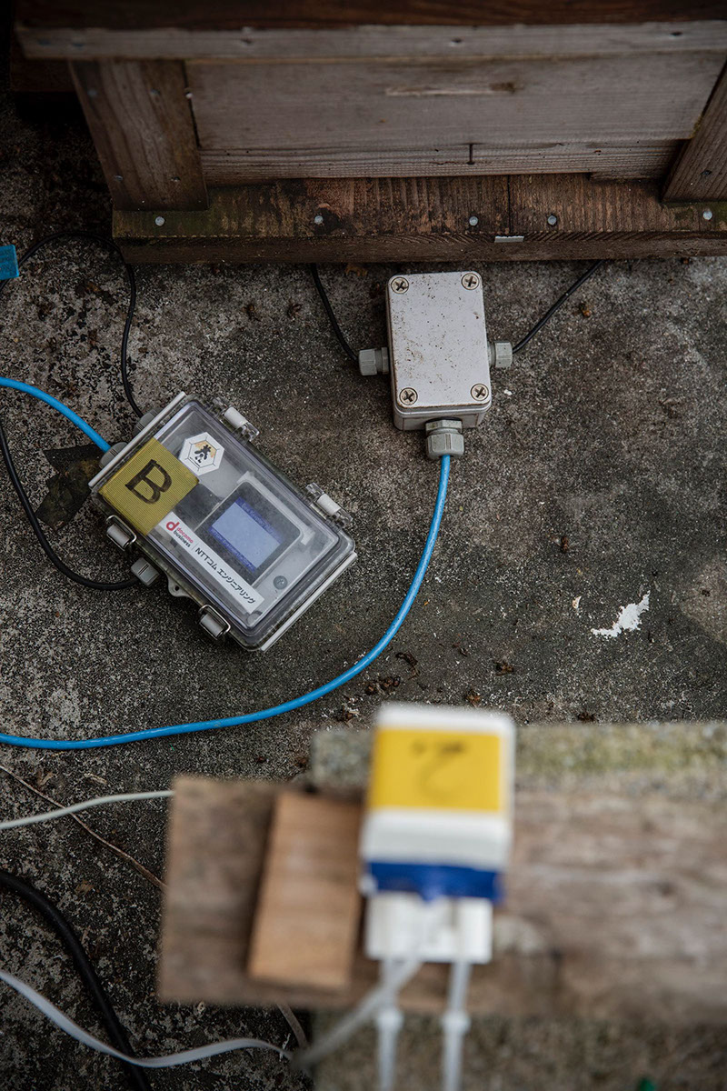 午後一番に店舗を訪ねると、伝さんの母朋子(ともこ)さん(76)が、「伝は3階(屋上)に居るみたいですよ」と知らせてくれた。連絡もせずに屋上の蜂場に上がると、蜂場手前の準備室に見知らぬ男性が2人、何やら真剣に話し込んでいて、私を見て驚いている。気まずい雰囲気だ。すると奥の蜂場から伝さんが「こっちこっち」と言う様に手招きして呼んでいる。突然のことで焦ってしまい、見知らぬ男性には挨拶もしないまま蜂場に入って行くと、伝さんが巣箱に設置された昔のカセットレコーダーのような機械を指差す。コードで繋がれ何かのデータを計測しているようだ。