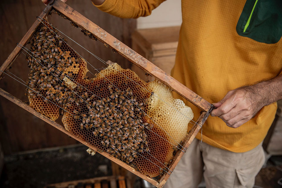 哲学的な話に少々戸惑いながらも、伝さんが目指す方向性は伝わってくる。すると次に伝さんが私に見せたのは、自然巣を針金で固定した巣枠だ。多くはないが蜜蜂は集っている。
